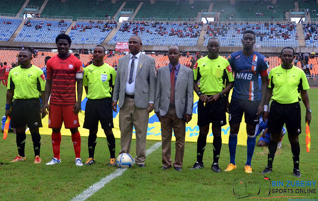 Kamisaa wa mchezo wa jana Nassor Hamdoun wa nne kushoto akiwa na marefa na Manahdha wa timu zote mbili jana