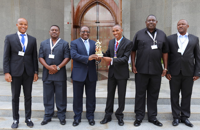 Hapa Simbu akimkabidhi tuzo hiyo Waziri wa Habari, Utamaduni, Sanaa na Michezo Dk. Harrison Mwakyembe