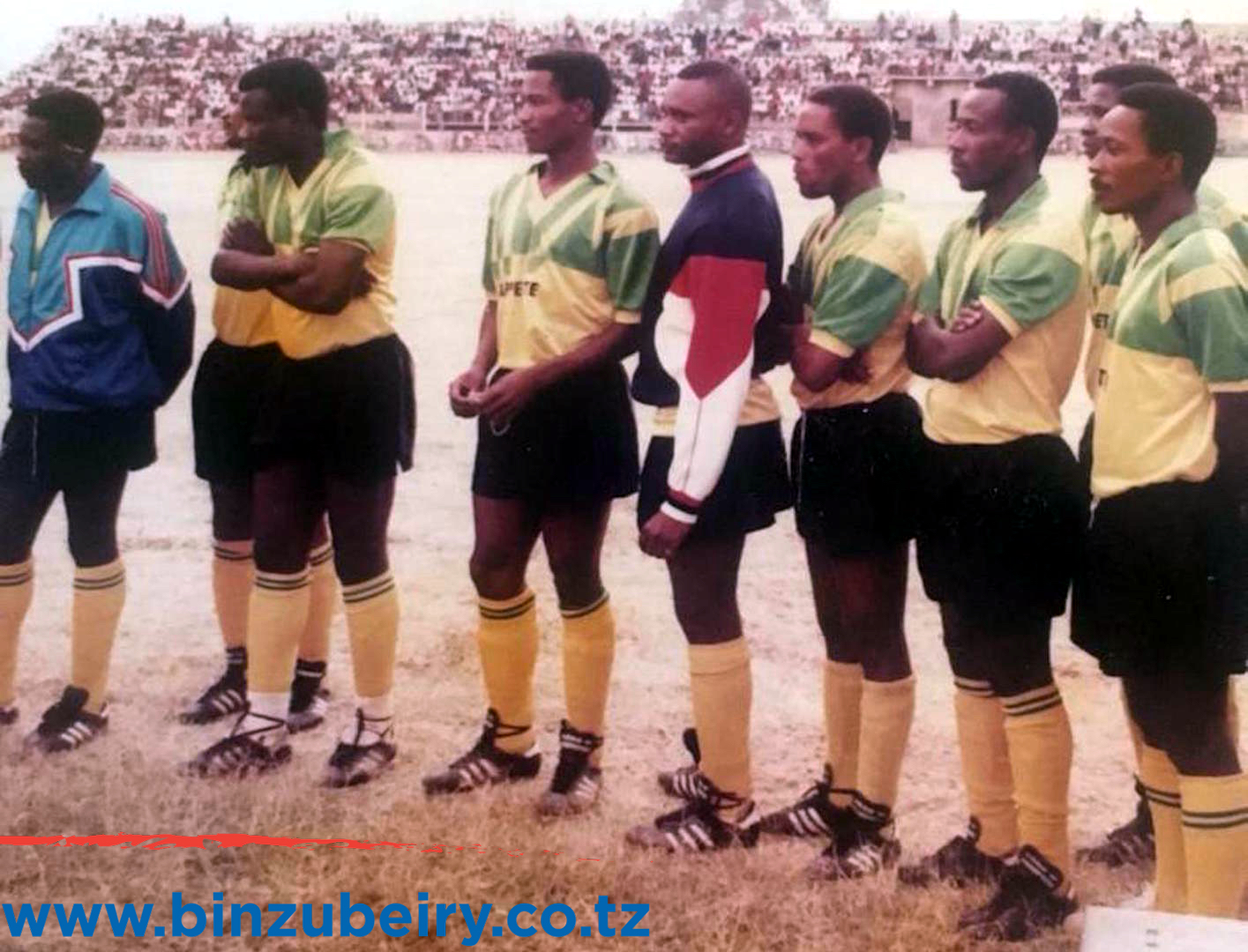 Wachezaji wa Yanga SC kabla ya moja ya mechi zao msimu wa 1992 kutoka kulia Deo Shundu, Hatibu Kibunda, wote Warundi, Said Zimbwe (marehemu), Steven Mussa (marehemu), Said Mrisho, Willy Mtandamema, Abeid Mziba, Issa Athumani (marehemu) na Godwin Aswile ‘Scania’.